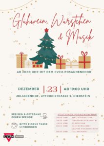 Der CVJM lädt zu einem Umtrunk mit Musik vom Posaunenchor in den Julianenhof Nierstein ein. Am 23. Dezember 2025 ab 19 Uhr können dort Glühwein, Punsch und Würstchen gegen Spende genossen werden.