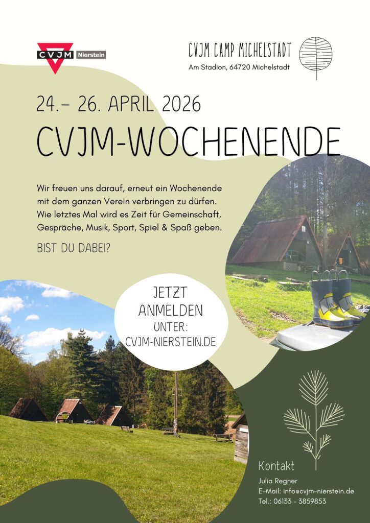Nächstes Jahr starten wir gemeinsam in unser drittes Abenteuer, an dem alle Mitgliederinnen und Mitglieder des CVJM-Nierstein teilnehmen dürfen. Vom 24. – 26. April 2026 genießen wir auf dem CVJM-Gelände in Michelstadt ein Wochenende voller Spiel, Spaß und Gemeinschaft. Wir werden gemeinsam kochen, singen, am Lagerfeuer sitzen und uns auf dem großen Freizeitgelände sportlich betätigen. Dabei stehen Freude und Miteinander immer im Vordergrund!